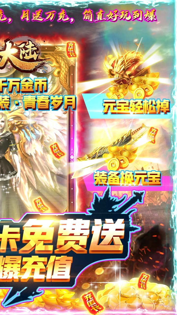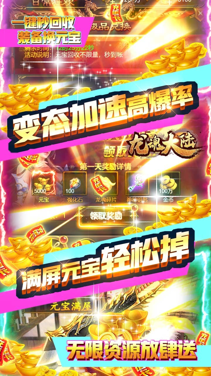 龙魂大陆作为一款放置类传奇手游,以传奇1.76为基础,完整的再现了传奇打怪爆装掉宝,野外抢boss,热血PK,沙巴克攻城,以及行会战等玩法。最新万人即时攻城MMORPG巅峰力作,炫酷的魔法效果,爽快的成长尝试,真正实现与宏大的手游世界即时互动尝试!画面绚丽,造型华美,超多的职业种类,畅快PK尝试,沙城齐聚,点燃征程!血战吧,兄弟,共铸热血传奇,重夺沙城之巅!