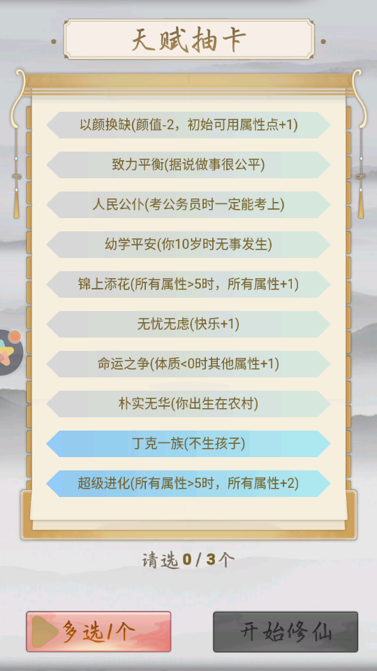 风格较为讨人喜欢,以文本方式进行你的修真之途,开场选择出身,提取你的天赋卡。