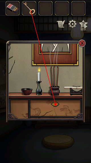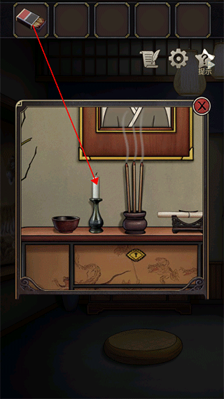 1、游戏开始后,依照提示点击台子,在台子上能够找到火柴,随后用火柴将蜡烛点燃。