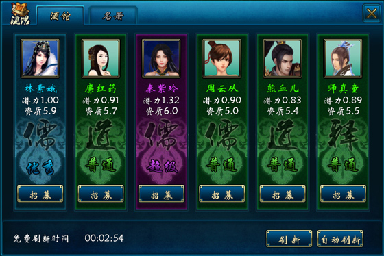 10级时接到任务在酒馆处招募散仙,10级时可以带一名散仙,然后每10级可以多招募一名。在招募界面左下方有一个免费刷新时间,每1小时有1次免费刷新将领的机会。