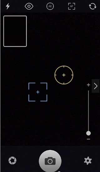 1、打开该应用后,界面十分简单,顶上一排五个图标分别是闪光灯控制,效果预览,自动曝光与自动对焦,还有反转镜头。
