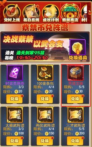 每天匹配战力较低的对手,要是匹配到战力高的对手,可选择取消(匹配后系统会显示取消按钮),确保自己每天至少能拿到28个币(未包含排名奖励)。排名依据大区的战力进行排序,通常前三都是氪金玩家。在紫禁商店中,紫禁币优先用于兑换阵法,待阵法达到满阶后,开始兑换天绝宝箱(每周可兑换5个)。该兑换内容每周会更新,据客服所说,是按照开区时间进行更新的。