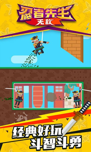 忍者先生无敌手游玩法简单,在游戏里玩家将在各式各样的场景中挑战脑洞闯关之旅,各式各样的武器道具合理运用方块过关,帮助忍者先生顺利解谜,在不断冒险中感受前所未有的战斗乐趣,还有超多关卡等着你哦。