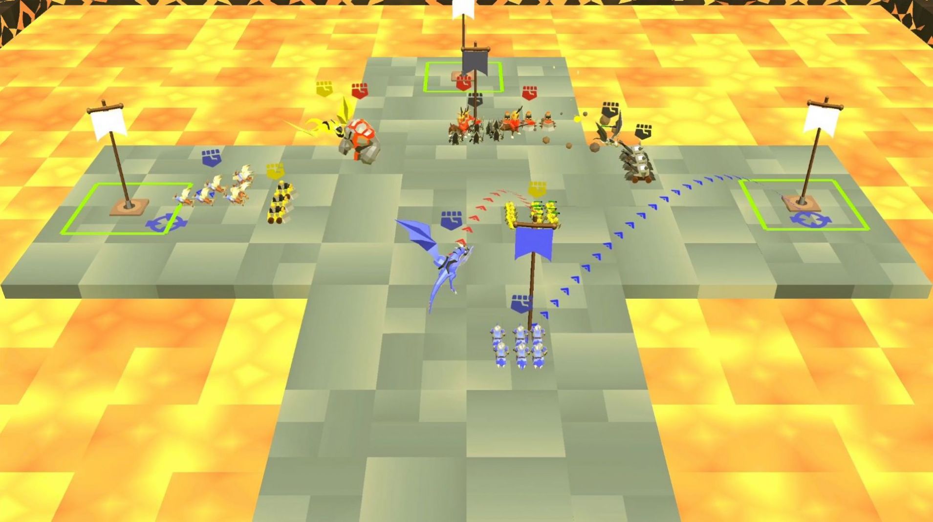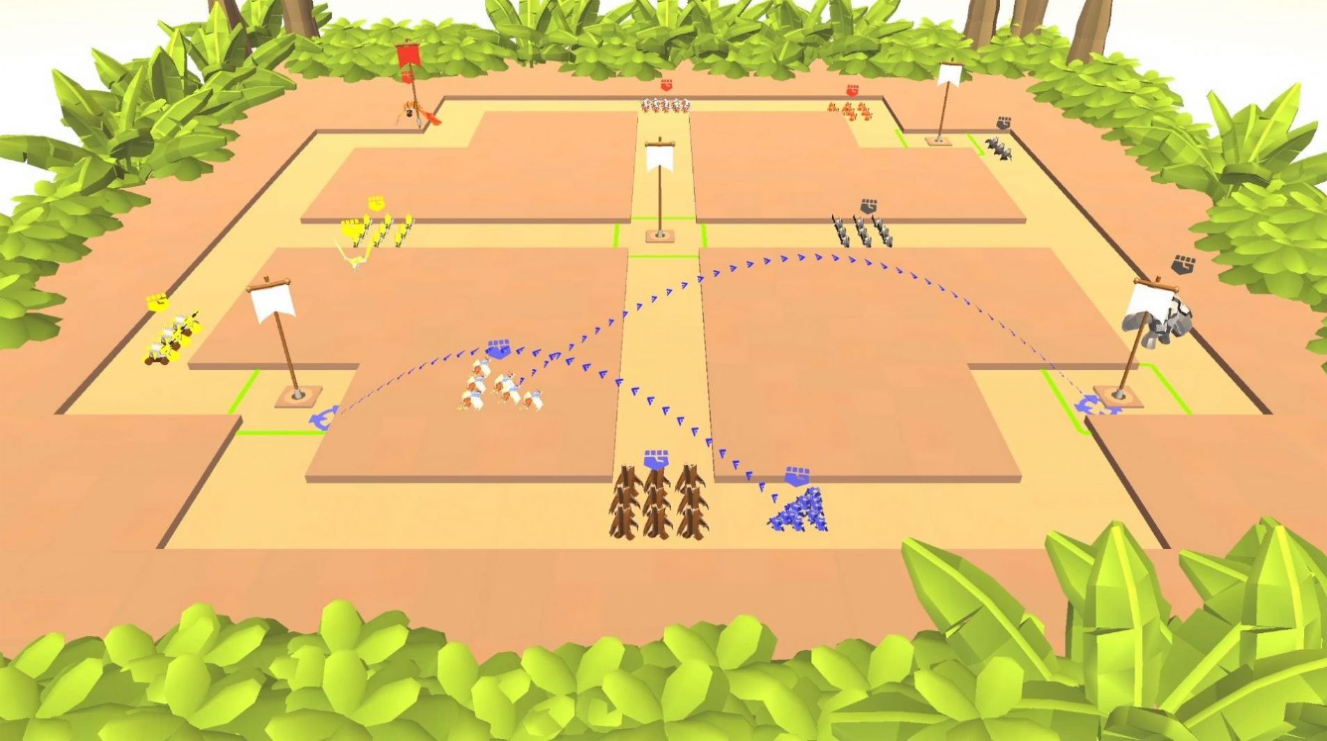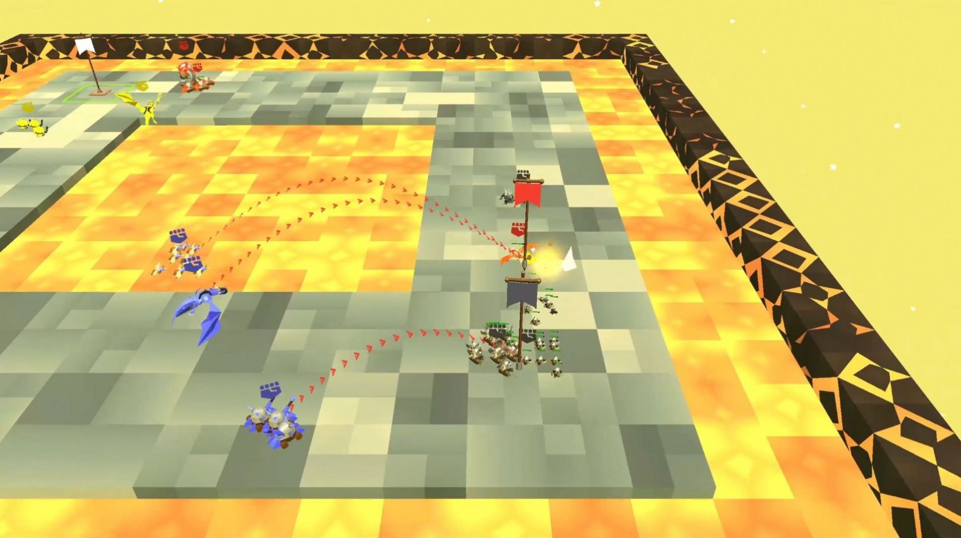 3、操纵出兵兵种、施放随机技能、升级资源,通过兵种搭配技能占领旗帜,赢得胜利。
