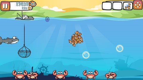 1、控制鱼群在海里的行动,注意躲避鲨鱼和螃蟹。