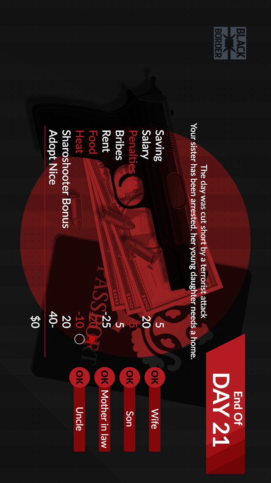 黑色边境作为一款具有深意的策略角色扮演手游,在游戏里面用户将扮演一名专业的海关工作人员,每天需要面对不同的旅客,对比确认他们的身份信息,你的选择将决定他们是否通过,喜欢的可以下载黑色边境手游尝试!