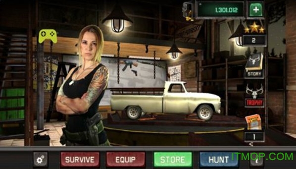 3、手游操作说明:进入手游主菜单界面,点击下方靠左边的“SURVIVE”-->弹出“CHOOSE HUNTING AREA”的界面,点击左边白色的“JULIETT”-->弹出“SURVIVAL BRIEFING”的界面,点击右下方“HUNT”-->弹出“REMEMBER”的界面,点击右下方“OK I GOT IT”即可开始手游。