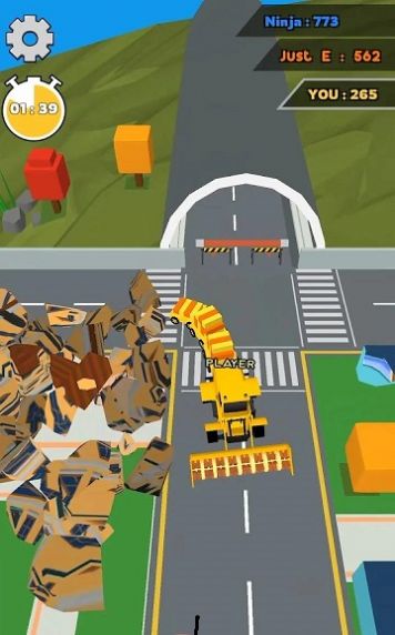 2、收集地上的建筑碎片就可增加收割机的长度,摧毁更大的建筑物。