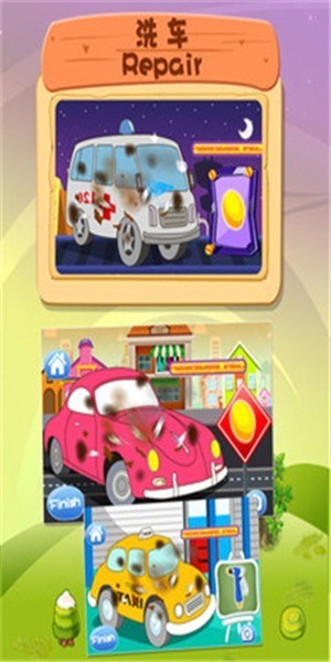 玩法说明:小朋友为不干净的车辆分步骤进行洗刷与清理。