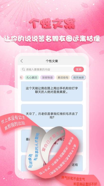 独特的文案:软件内置了丰富的文案库,用户无需手动复制粘贴,即可一键获取适合不同场景的文案内容,让社交分享更加轻松便捷。
