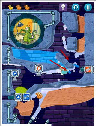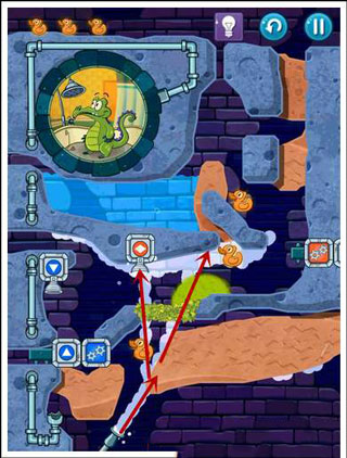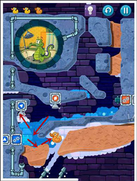 3、清水会去开启蓝色机关,这里设置好一个U型通道去收集好鸭子,等鸭子收集好后,划开泥土让清水进入小顽皮屋子就可以。