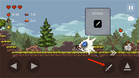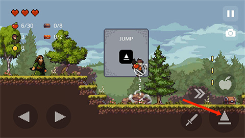 2、和游戏NPC完成对话后继续往前,右下角的三角形图标为跳跃键,尝试跳跃去接取图中的苹果。