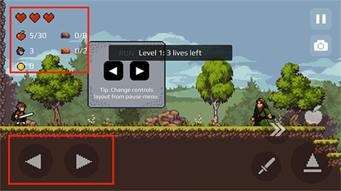 1、点击开始选项,进入游戏屏幕,会显示当前角色等级为1级,有三条生命值,屏幕左侧的按钮为方向键。