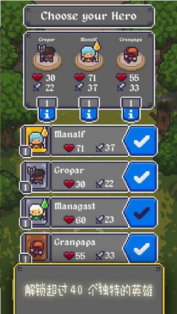 也会滑动屏幕还能让角色在场景中四处移动,你要灵活的制定自己的战略,还要获得战利品并施放新的法术,你要成为让人闻风丧胆的勇士并为自己的王国效力,作品的像素主题风格完美的展现了老式街机的画面,这也让作品变得古怪另类且极具幽默感,这部作品中的角色拥有自己的独特特长。