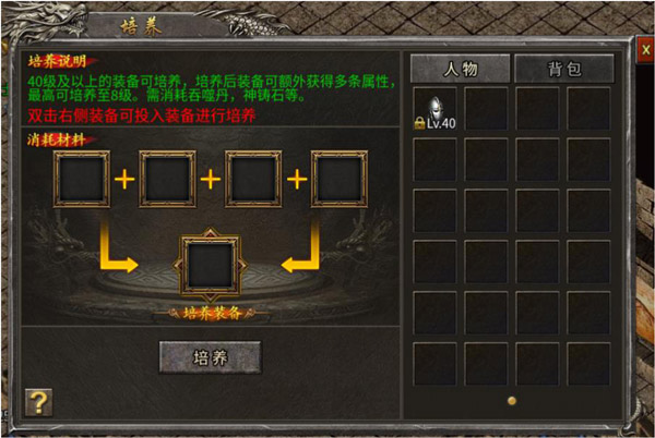 (2)培养装备:40级装备开始,就可以通过不断吞噬同等级同部位的装备,来培养装备;这意味着从40级装备开始,每件40级装备都是值钱的,因为我们的游戏升级很慢,所以保值率会很高。可以给玩家强调价值。培1-培3有1条基础词条,培4增加1条特殊词条(戒指部位可以通过洗练,洗练出麻痹、复活、护身属性。我们这个版本没有专门的特戒,所以这个培4几乎是除土豪外,人人都要做的,至少做一个,洗出复活属性),培8再增加1条基础词条。基础词条可以洗练攻防、特殊词条可以洗练出特殊属性。综合来说走培养装备路线是性价比非常高的。在做引导的时候,可以告诉玩家培养装备可以分解,分解可以获得消耗材料的60%(适用于小R和中R)