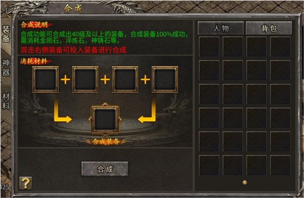 如何获取,两种方式:野外打怪掉落和合成。合成是30级常规装备合40级常规装备起步,武器、衣服二合一,饰品五合一。