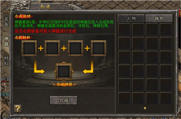 属于最高级装备,玩家通过开(获取途径:找玩家收或者爆——野外世界行会亡魂福利BOSS、野外小怪、活动)神器宝箱(开一次100金元,获得50神器碎片和随机价值6-50RMB的材料),获得神器碎片。在神器兑换界面,消耗神器碎片兑换神器。兑换的神器为神1等级,需要二合一的方式,逐级合成,最高合到神6等级。神器要么不玩,要么至少玩神5。因为神5就有2个基础词条和2个特殊词条,对比同等级其他装备优势就开始明显。(现版本大幅加强了神器,可以引导土豪做神器。神豪可以引导做全身神6)