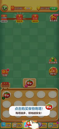 1、进入游戏后首先点击下方购买食物炮塔,炮塔越多,领地越安全