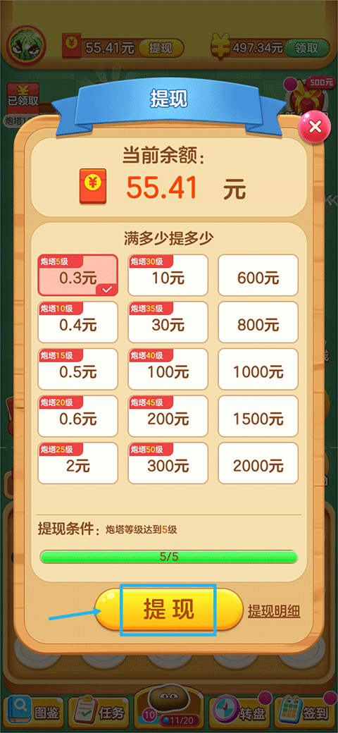 5、当炮塔等级到可以提现红包时,选择可以提现的金额并点击提现即可