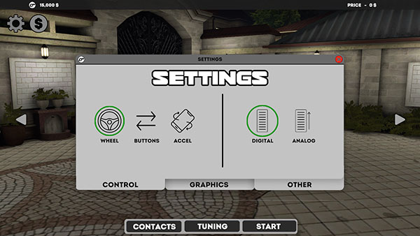 3、轻点右上角的“设置”图标,便能对驾驶方式进行设定,可选择通过方向盘控制,也能选择以手机晃动来控制。