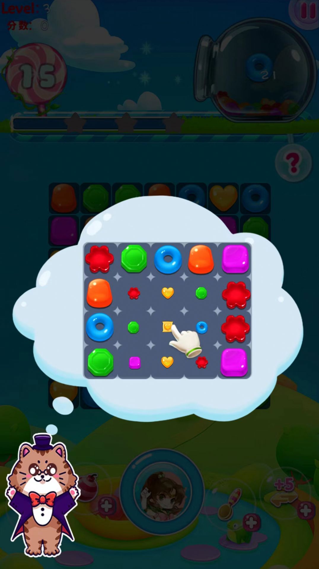 2.糖果消除后会得到分数,累积分数到达一定的目标,就能进入下一关,还能获得相应的奖励。