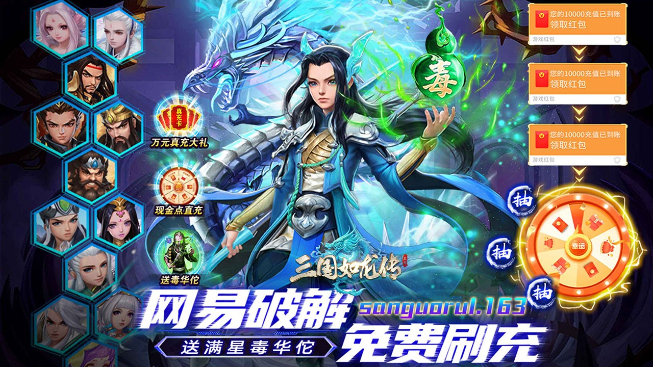 2、创建角色即送10000元真实充值,签到再赠10300元真实充值,上线即获VIP12特权。每天可参与现金点转盘抽奖!