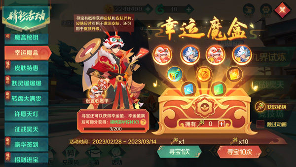 2、精彩活动包括魔盒密钥、幸运魔盒、皮肤特惠、妖灵爆爆爆、转盘大满贯、许愿天灯、征战昊天、豪华签到、招财进宝等