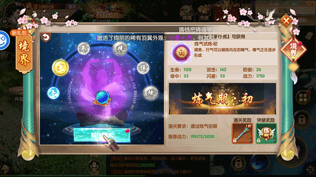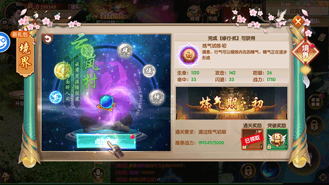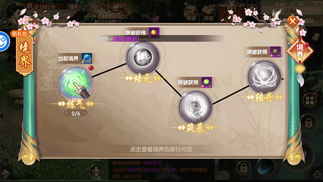 1、进入游戏并获得第一只坐骑后,玩家即可通过任务提升自身境界,此时需在游戏界面中找到并点击“当前境界”的区域选项。