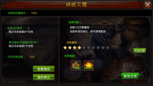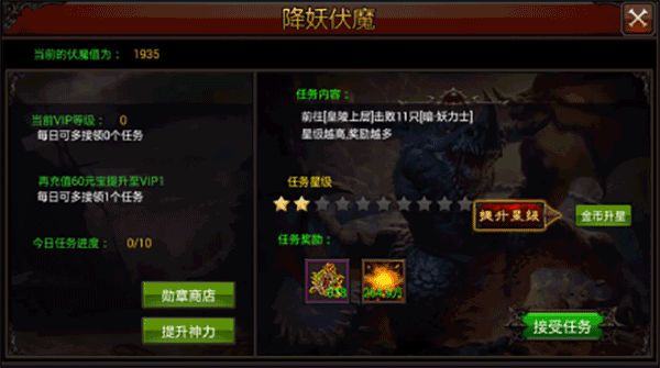 b、点击“立即前往”按钮,能够打开接受任务界面;点击“金币升星”按钮,能够提高当前奖励的数量;点击“接受任务”,则可领取降妖伏魔的任务。