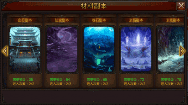 c、角色等级提升后,可参与的材料副本种类会相应开放。每种副本玩家在当天内有2次通关机会,若通关未成功,不扣除次数。