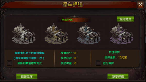 b、与人物对话完毕后,能够开启押镖的任务界面。在此界面中,通过点击刷新品质界面,能够改变押镖奖励的数量。点击“我要押镖”按钮,便可领取镖车。