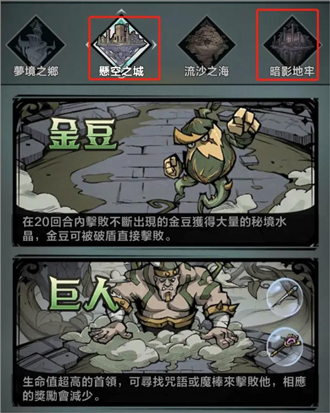 1、建议优先选择悬空城和暗影地牢。初期直接刷悬空城,能获得大量秘境水晶,快速兑换英雄,还能获取金豆子。