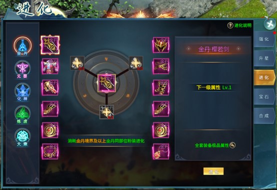 进阶系统有光翼、神兵、仙迹、阵法四条进阶线,各分为化形与战装。化形可以使用进阶丹升级进阶线,穿戴进阶装备,使用丹药来增强进阶属性和技能效果,还可以学习特殊技能额外加强技能效果。