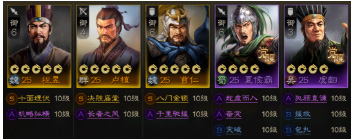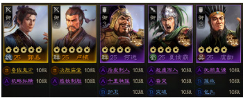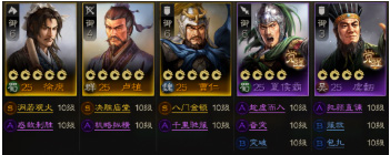 该阵容搭配“英雄传记”完成后系统赠送的武将卢植、签到第一天赠送的夏侯霸,紫将可以选择虞翻+朱桓+黄权+何进,其中朱桓传承战法【千里驰援】,黄权传承战法【机略纵横】,开局系统赠送的关平和朱然也分别传承战法【奋突】【惑敌制胜】,这样该阵容就已搭建完成。