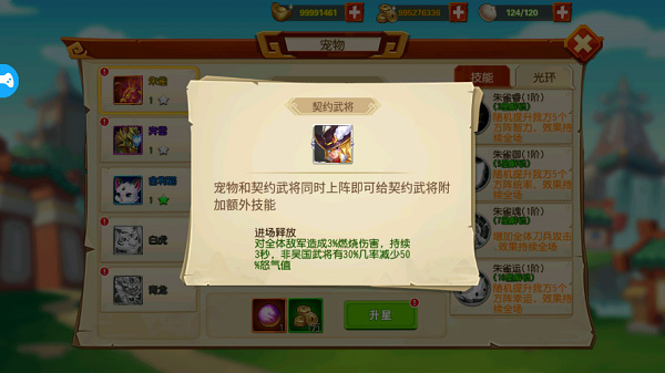同时,除了舍利猫以外,其他宠物都有与武将定下契约,与定下契约的武将共同上阵,可以为契约武将增加额外技能,如朱雀可以为周瑜提供一个对全体敌军造成燃烧伤害的技能。