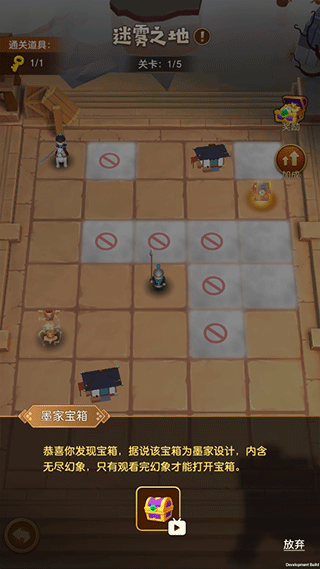 通关规则:迷雾境地共设为5个关卡。每轮关卡共有35个格子,每个格子都会触发随机事件,通过探索翻开迷雾格子找到到通关钥匙,即可通往下一关卡。最后有一个关卡为BOSS关,需打败BOSS才能成功通关。
