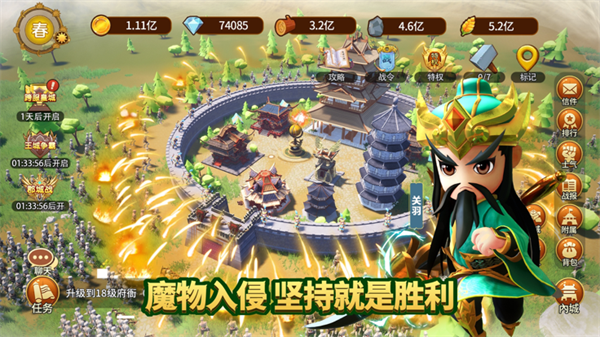 五大兵种一键合成,佛系挂机获取超高资源收益,自动推图扫荡更为轻松,多种休闲护肝设计助力畅游三国!