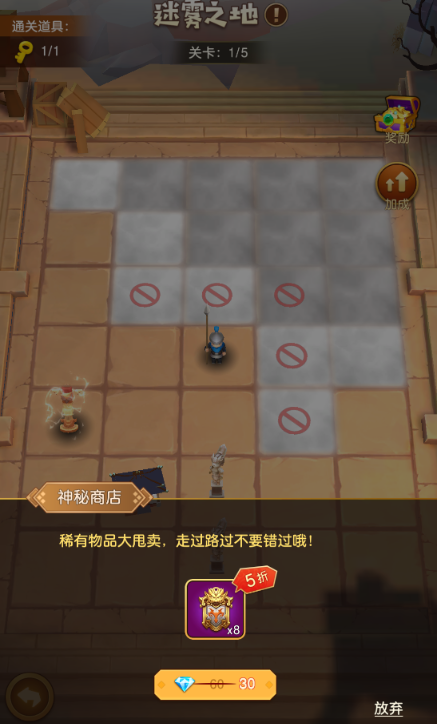 通关规则:迷雾境地共设为5个关卡。每轮关卡共有35个格子,每个格子都会触发随机事件,通过探索翻开迷雾格子找到到通关钥匙,即可通往下一关卡。最后有一个关卡为BOSS关,需打败BOSS才能成功通关。