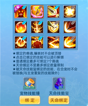 绑定:在镶嵌其他兽魂前,最好把需要的兽魂先进行绑定,可以使用宠物技能锤或者天命技能玺绑定,但需要注意当主宠的技能被天命技能玺绑定时,合宠才会保留下被天命绑定的兽魂技能