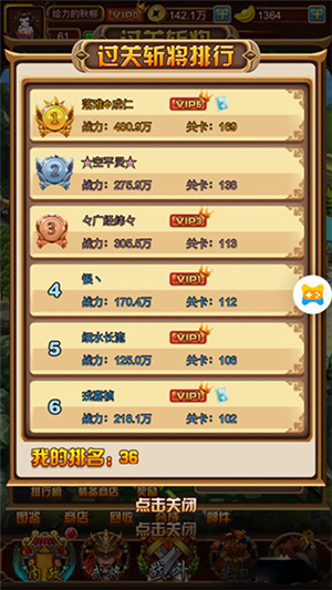 在排行榜中可以查看排行,包括对应的战力以及成功挑战的关卡,自己的排名情况在下方也会显示,如下。