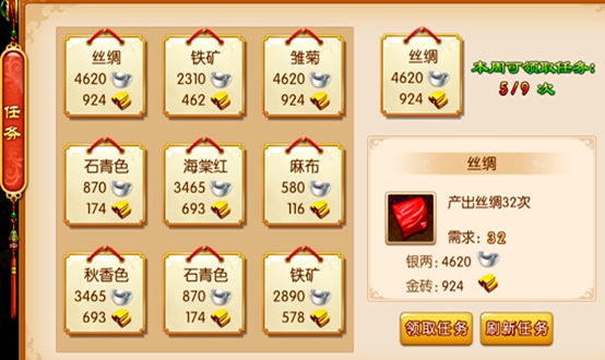 派系任务每周更新一次,每周可以领取9次任务, 每完成一个任务可以获得银两和金砖奖励。如果有些任务比较困难,小主可以选择刷新任务,更新较为简单的任务。