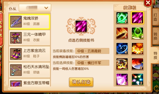 装备特技包括中级特技和高级特技。技能还包括装备特技,打造装备有概率自带中级特技,但是特技类型是随机出现的,使用制造石可以提高自带特技的概率。