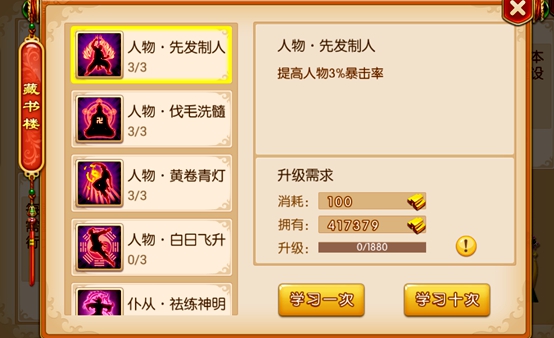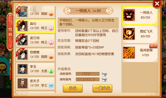 技能升级等级越高,需要消耗的材料和银两越多。
