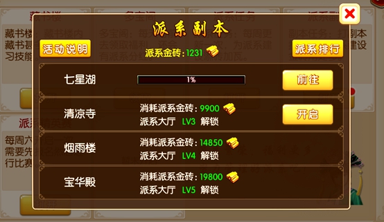 派系帮主和副帮主拥有开启副本权限,派系副本开启需要消耗派系金砖以及派系大厅达到规定等级。