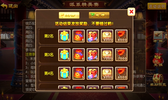 每周三举行一次精英赛,连续两天,参与可获得声望,可用于兑换商场道具。(精英赛参与人数有限制,派系等级决定可参加的精英赛人数)最终排名奖励包括金砖、内丹、1级随机宝石包、声望和势力值。(势力值直接影响派系排名,也会影响玩家官品排名)