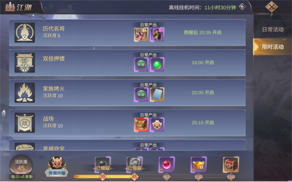 每天的限时活动也可以获得大量的经验,特别是金榜题名和家族领地战。