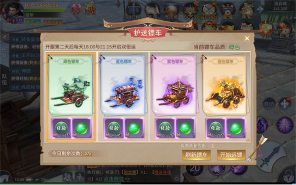 押镖可以获得大量的经验,可以通过消耗绑定元宝来刷新镖车,镖车等级越高获得的经验越高。每天16点~16点30分、21点15分~22点押镖的话可以获得双倍的经验奖励。
