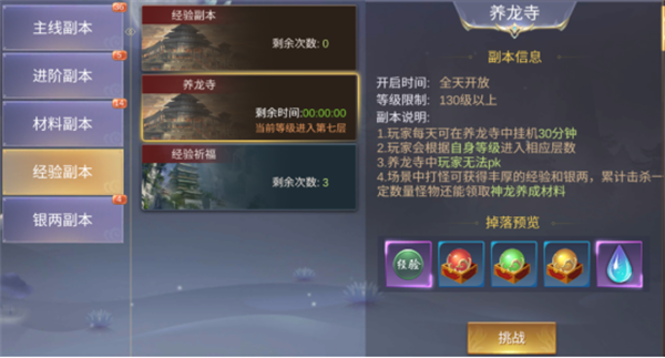 每天可以在养龙寺中挂机30分钟,在养龙寺中击杀小怪是在正常地图击杀的几倍经验哦。并且还有银两和材料获取。