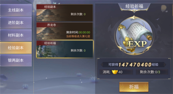 氪金的玩家可自行使用元宝进行祈福,获取海量经验。