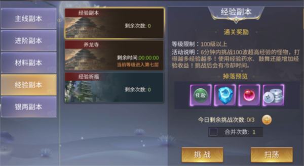 人物达到65级之后会开启经验副本,每天有2次的挑战机会,使用1.5(有二倍经验药的情况下先用二倍的)倍经验药水可以额外获得50%的经验,可以使人物快速升级。提升VIP等级还可以额外增加副本次数。
